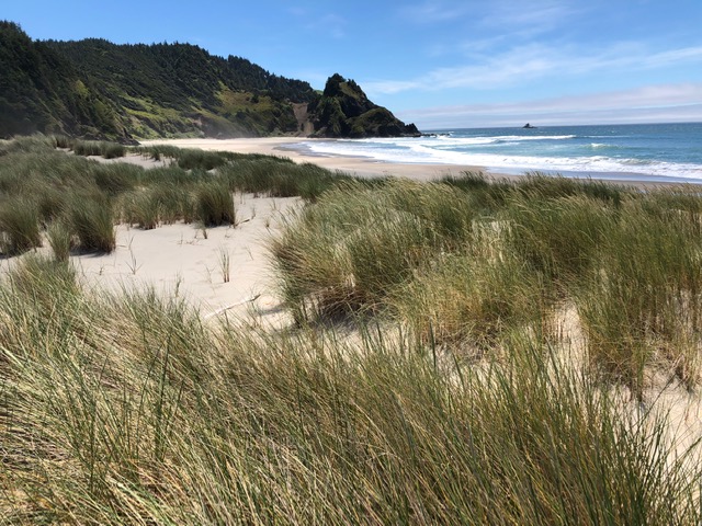 Isolated and well-protected, the site harbors a wide diversity of habitats and flora: an extensive beach with both yellow and pink sandverbena (Abronia latifolia and A. umbellata var. breviflora), which are state listed as endangered and federally listed as species of concern; dunes with both American dunegrass (Leymus mollis) and European beachgrass (Ammophila arenaria); a forest on older, now stabilized, dunes with shore pine (Pinus contorta var. contorta) and an understory of rattlesnake plantain (Goodyera oblongifolia) and false lily-of-the-valley (Maianthemum dilatatum); dramatic cliffsides with Bolander's packera (Packera bolanderi var. bolanderi), Tracy's mistmaiden (Romanzoffia tracyi), and Oregon stonecrop (Sedum oreganum).