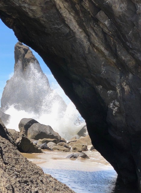 Tunnel, wave, and sea stack on the beach at Camp Westwind