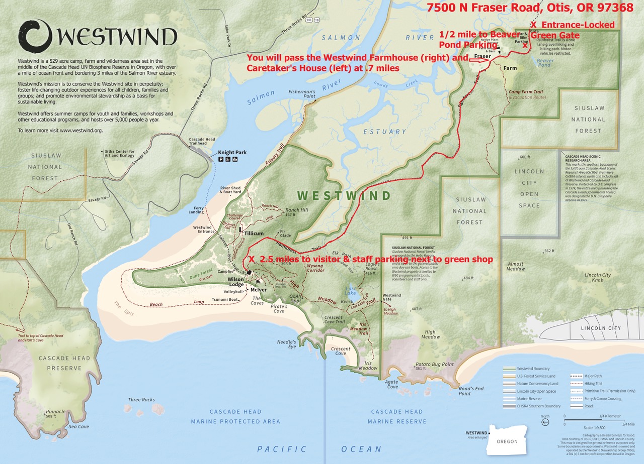 Trip Description: Nestled between two basalt headlands (Cascade Head to the north and High Meadow to the south), Camp Westwind serves as a natural sanctuary. It sits in a beautiful bay beside the Salmon River Estuary. The 529-acre camp was founded in 1936 and is a component of the UNESCO Cascade Head Biosphere Reserve. It is now owned by the Westwind Stewardship Group whose mission is to permanently protect the site as an educational retreat and camp.