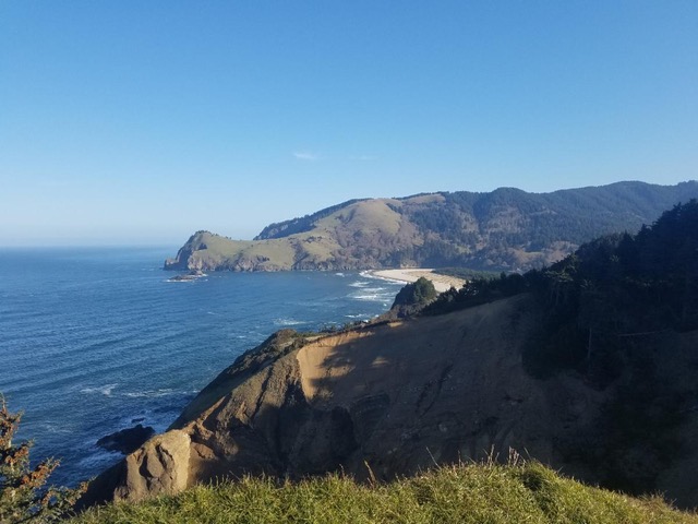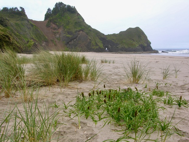 The beach hike includes an extensive beach with both yellow and pink sandverbena (Abronia latifolia and A. umbellata var. breviflora, which is state listed as endangered and federally listed as a species of concern); dunes with American dunegrass (Leymus mollis) and European beachgrass (Ammophila arenaria); a forest on older, now stabilized, dunes with shore pine (Pinus contorta var. contorta) and an understory of rattlesnake plantain (Goodyera oblongifolia) and false lily-of-the-valley (Maianthemum dilatatum); dramatic cliffsides with Bolander's packera (Packera bolanderi var. bolanderi), Tracy's mistmaiden (Romanzoffia tracyi), and Oregon stonecrop (Sedum oreganum).