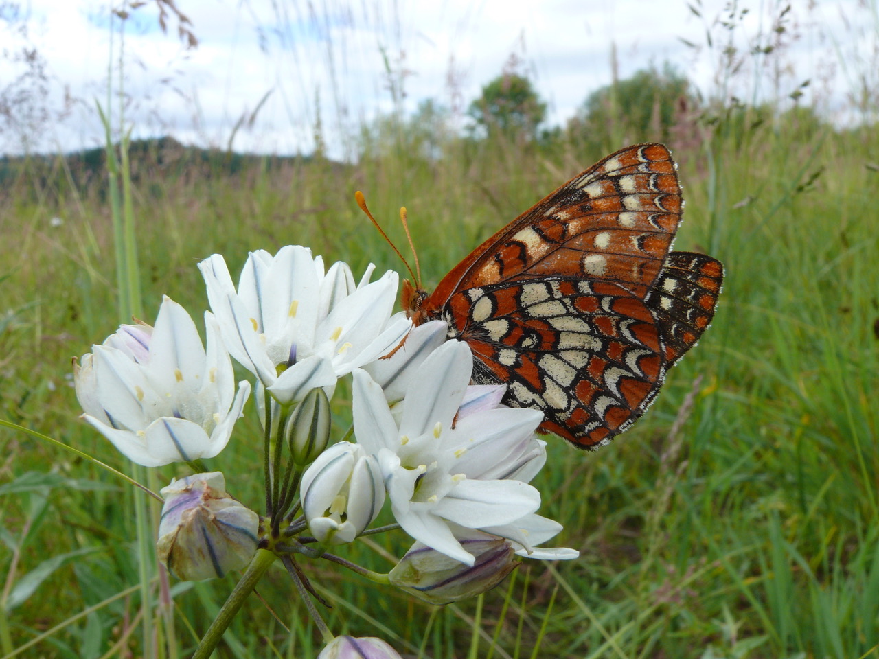 Checkerspot butterfly on fool's onion (Triteleia hyacinthina) at Deer Creek Prairie Park in 2014
